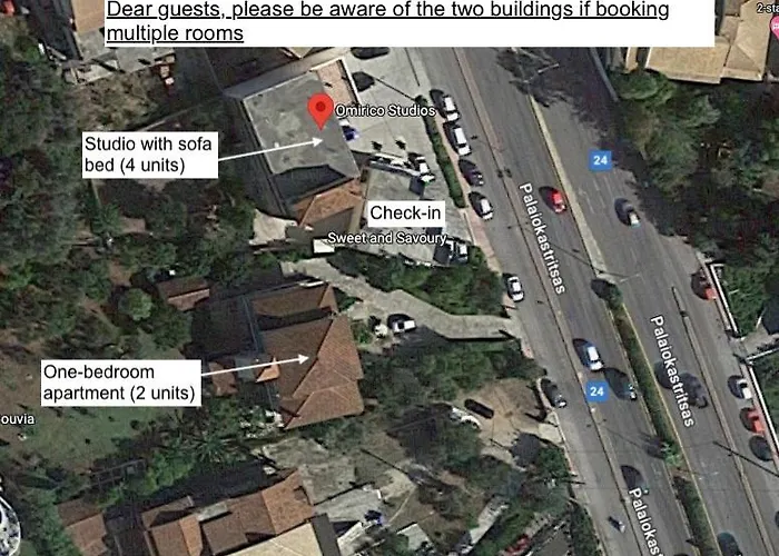 Apartamentul din Gouvia se află la 15 minute cu mașina de Plaja din Ermones și la 20 de minute cu mașina de Portul din Corfu. De asemenea, Omirico Studios se află la 2.8 km de Muzeul Kapodistrias.